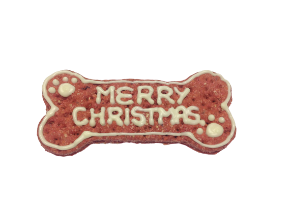 Spread Christmas cheer with our handcrafted Merry Christmas Bone treat! This festive bone-shaped biscuit is lovingly baked with delicious berry flavors and beautifully decorated with a special Christmas message, making it the perfect way to celebrate the season with your beloved pup.